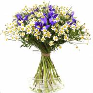 Композиция построена на контрастах цвета и формы. Нежные, наивные ромашки символизируют честность, искренность, душевность. Утонченные, яркие ирисы выражают трепетное отношение к дружбе и благородство. Такой букет можно подарить любимой девушке в качестве выражения признательности и доверия, а также подруге в знак того, насколько сильно вы дорожите дружбой с этим человеком.